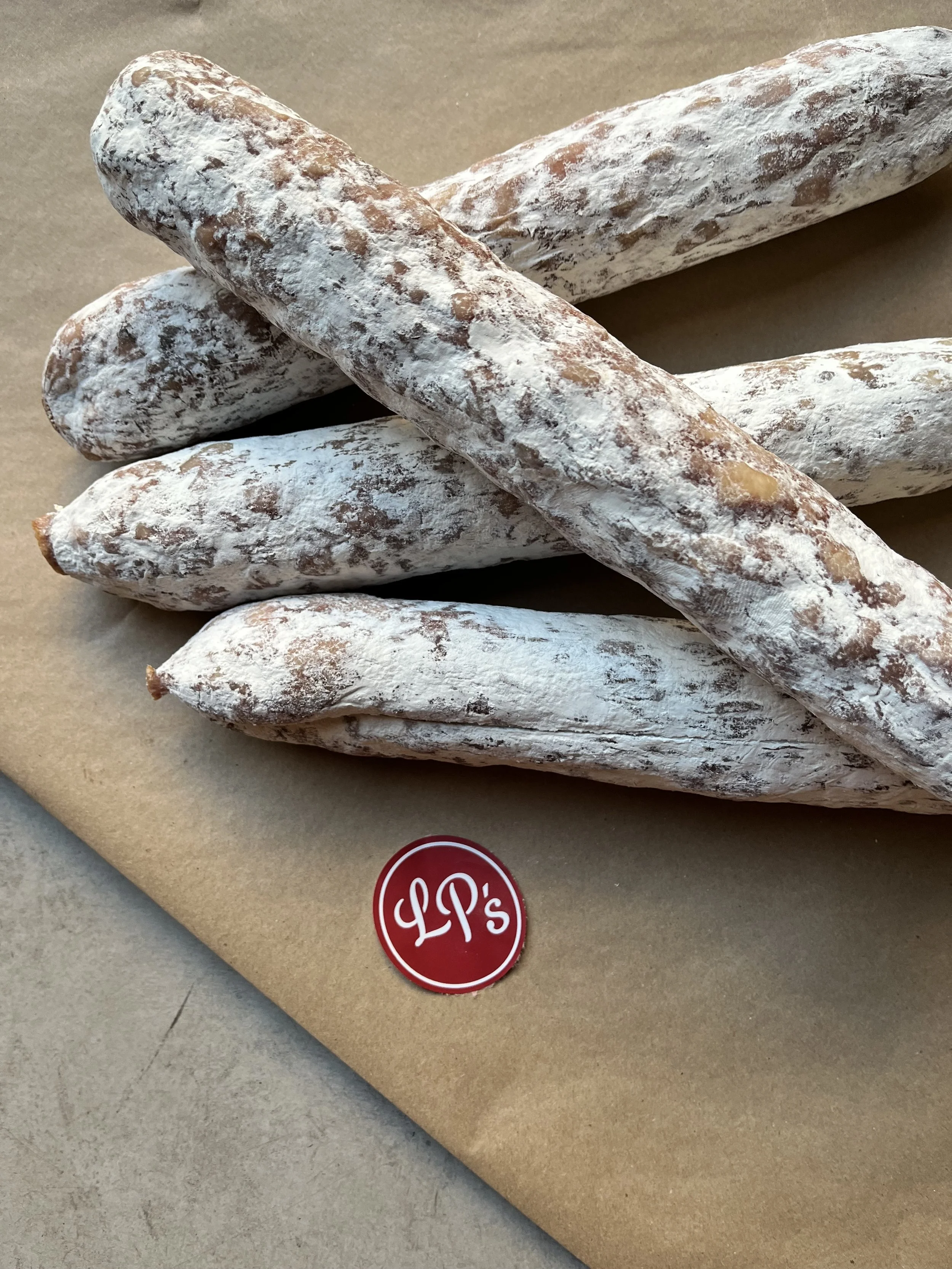 LP's Saucisson Sec is made with free-range pork and simply seasoned with garlic and black pepper, then mould-ripened until mature